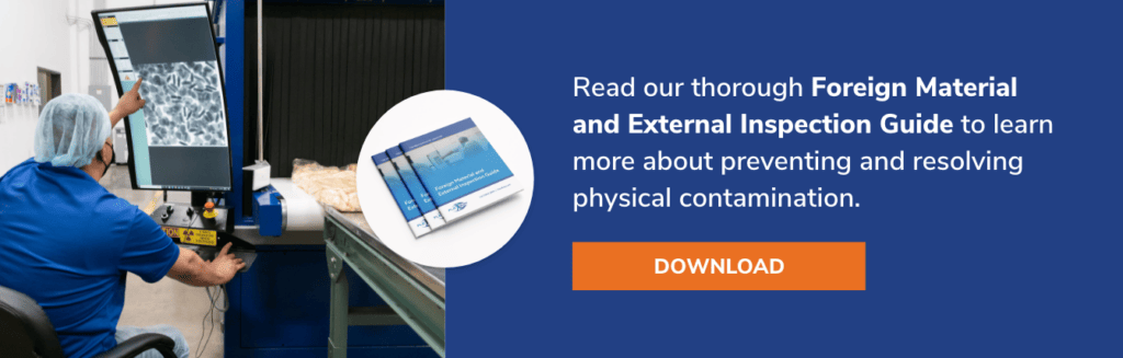 If the area turns out to be a foreign material, the product is removed from the line for safe and proper disposal, and then the rest of the production run is inspected to ensure there aren’t any other contaminants.